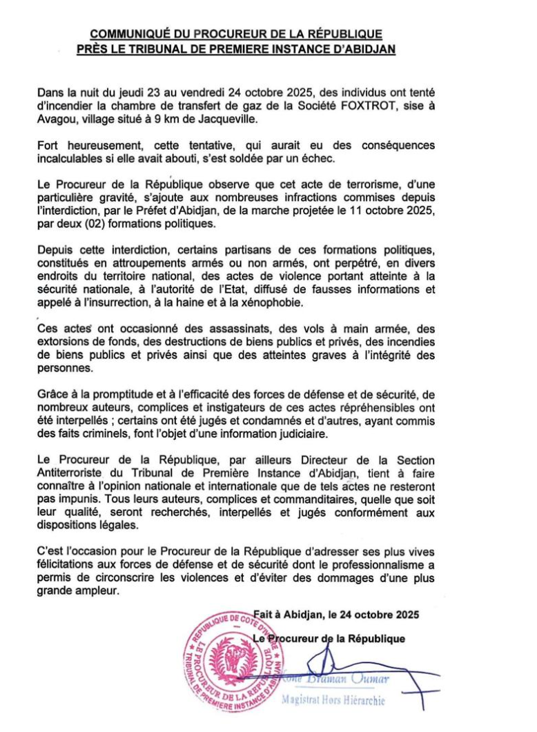 Le Procureur de la République près le Tribunal de première instance d’Abidjan a publié, le 24 octobre 2025, un communiqué relatif à une tentative d’incendie survenue dans la nuit du 23 au 24 octobre sur le site de la société FOXTROT, à Avagou, dans la commune de Jacqueville. Selon le communiqué, des individus non identifiés ont tenté d’incendier la chambre de transfert de gaz de cette entreprise, qui opère dans un secteur hautement stratégique pour l’économie nationale.