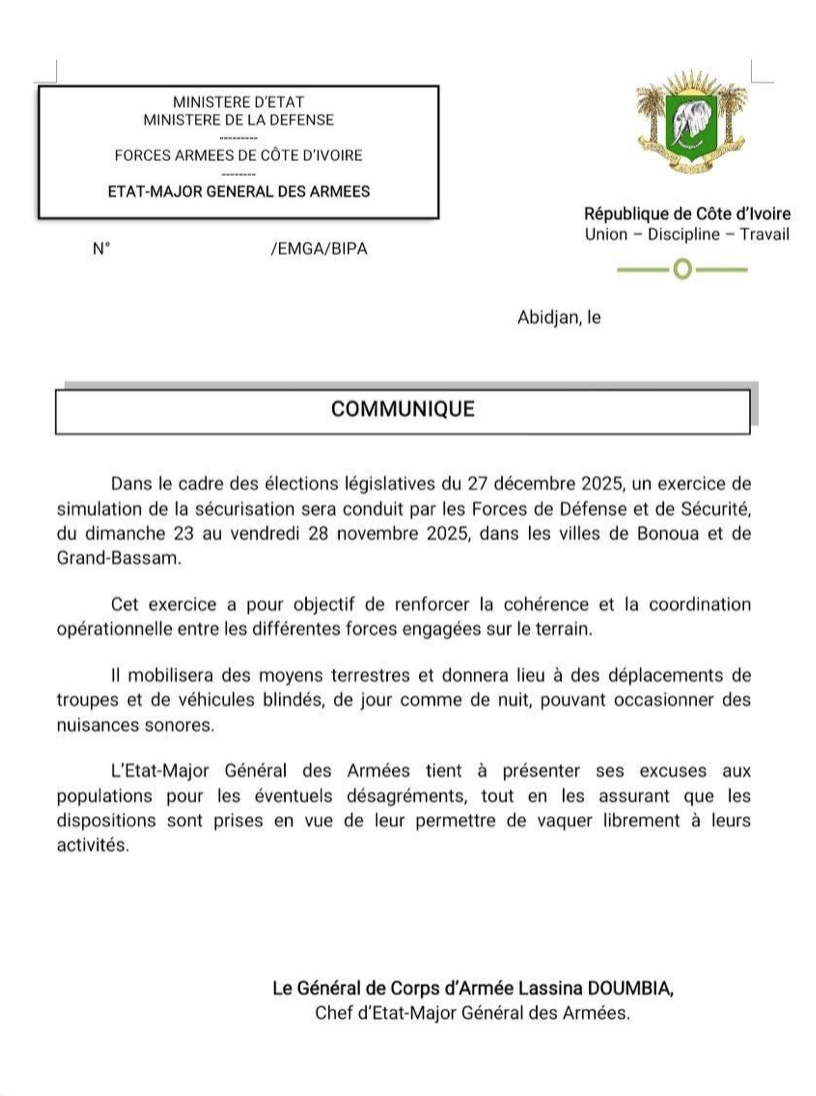 À quelques semaines des élections législatives de décembre 2025, l’État-Major Général des Armées a annoncé ce jour le lancement d’un important exercice de simulation de sécurisation, prévu du 23 au 28 novembre 2025 dans les villes de Bonoua et Grand-Bassam.