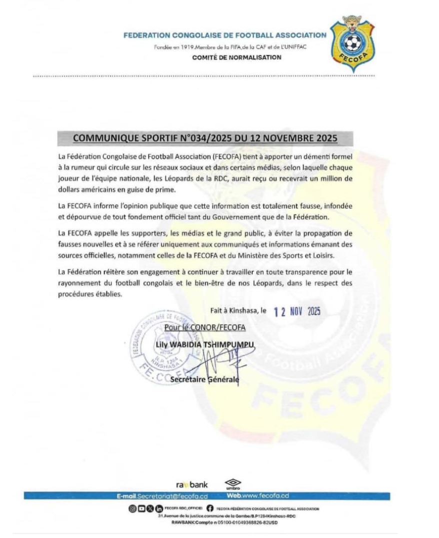 La FECOFA met les choses au clair et dément formellement cette rumeur. Découvrez le communiqué officiel ci‑après.