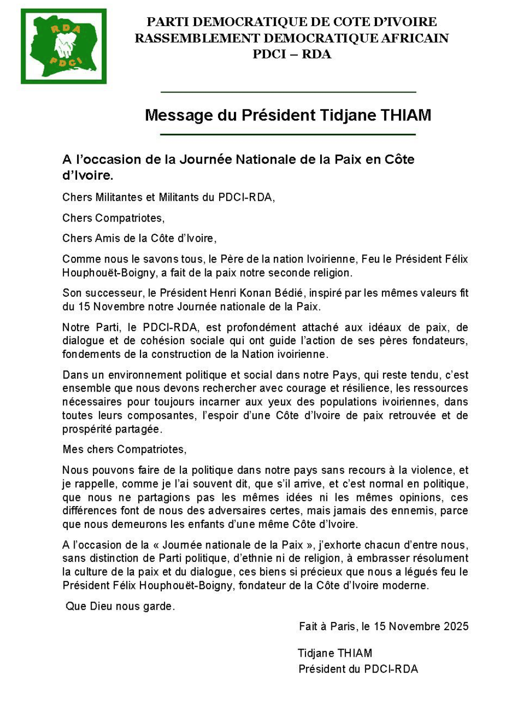 À l’occasion de la Journée Nationale de la Paix, le Président du PDCI-RDA, Tidjane Thiam, a adressé un message fort à l’ensemble des Ivoiriens, rappelant l’importance du dialogue, de la tolérance et de la non-violence dans la vie politique et sociale du pays.