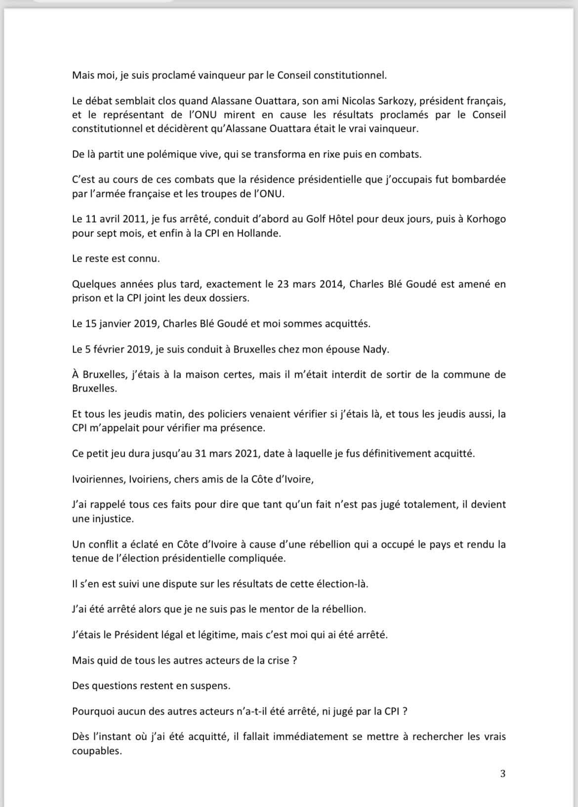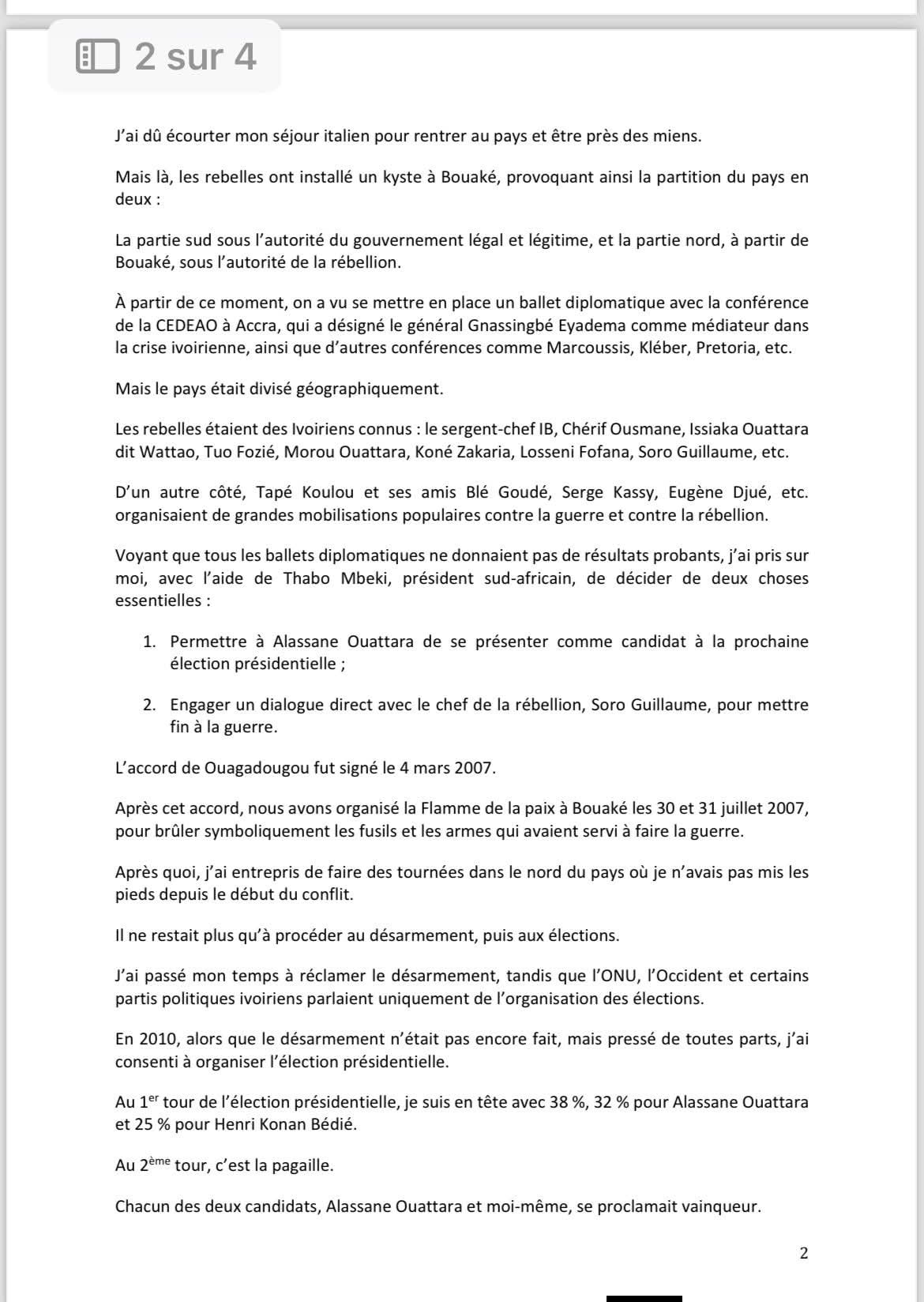 Dans ce document, l’ex-chef de l’État revient longuement sur les grandes étapes de la crise politique et militaire qu’a connue la Côte d’Ivoire depuis les années 2000. Il évoque notamment la découverte du charnier de Yopougon, la rébellion armée de septembre 2002, la partition du pays, les différents processus de médiation internationale ainsi que l’élection présidentielle de 2010.