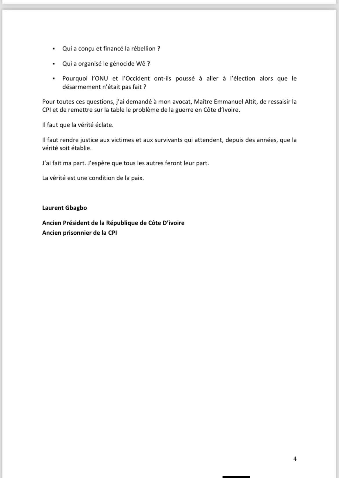 Laurent Gbagbo rappelle avoir, selon lui, favorisé des mesures de sortie de crise, notamment l’ouverture du jeu politique et le dialogue avec la rébellion, ayant conduit à la signature de l’Accord politique de Ouagadougou en 2007. Il revient également sur l’organisation de l’élection présidentielle de 2010 dans un contexte marqué par l’absence de désarmement complet des ex-combattants.